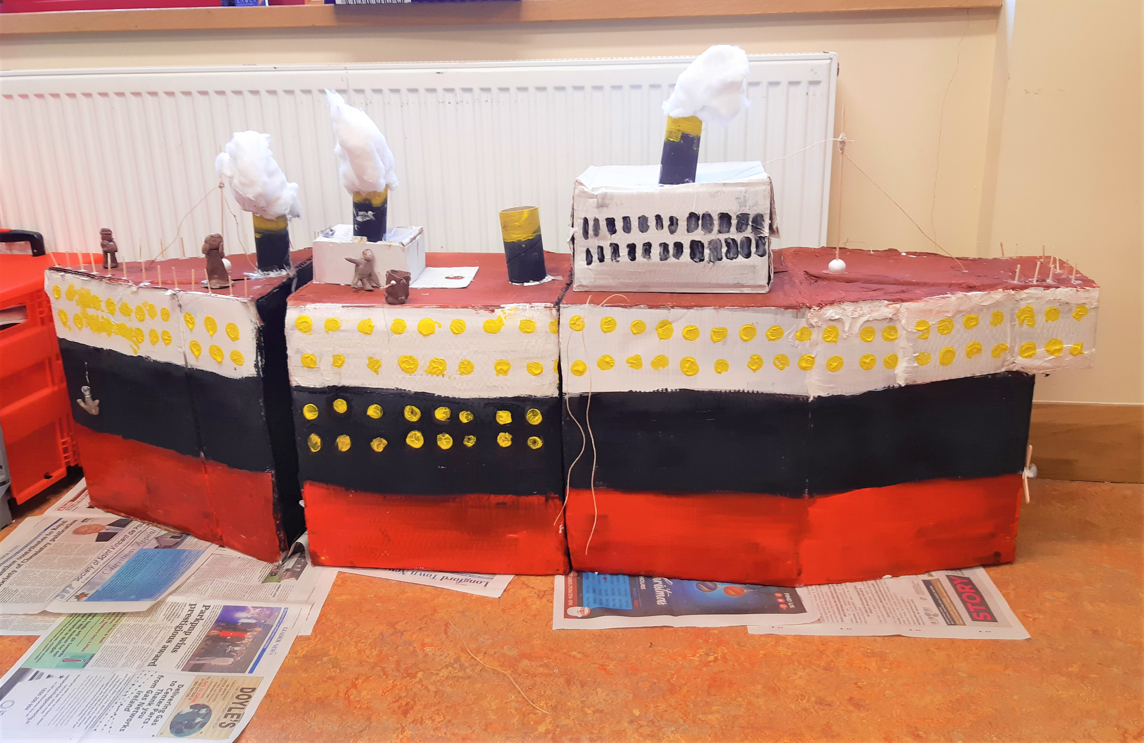 In St Teresas NS Killoe, 6th Class focused on the link between their native parish of Killoe and the Titanic disaster. The children completed different visits, projects, drawings, poems and fact files on the Titanic. Local artist Mary Smyth helped the children design and construct a large, scale Titanic boat where children worked in groups constructing, painting and clay making.