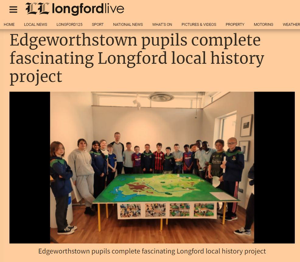 A Creative Cluster project with St. Mary's NS Edgeworthstown involved tours of the county, research into local history and a piece completed with the help of local artist Mary Smyth. The art piece is a 3D large-scale map of Longford with clay models to indicate places of historical significance around the county.